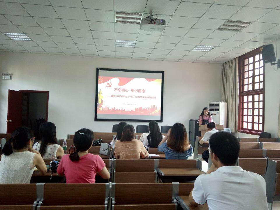 为加强毕业生党员教育,进一步提高毕业生党员党性意识和组织观念,始终保持党员先进性,充分发挥毕业生党员的先锋模范作用,5月17日下午,湖南大学马克思主义学院在301多媒体报告厅举行以“不忘初心,牢记使命”为主题的2018届毕业生党员教育大会,学院党总支书记陈宇翔老师出席此次会议。大会由2015、2016级硕士研究生党支部书记张苾莹主持,学院全体毕业生党员参加。